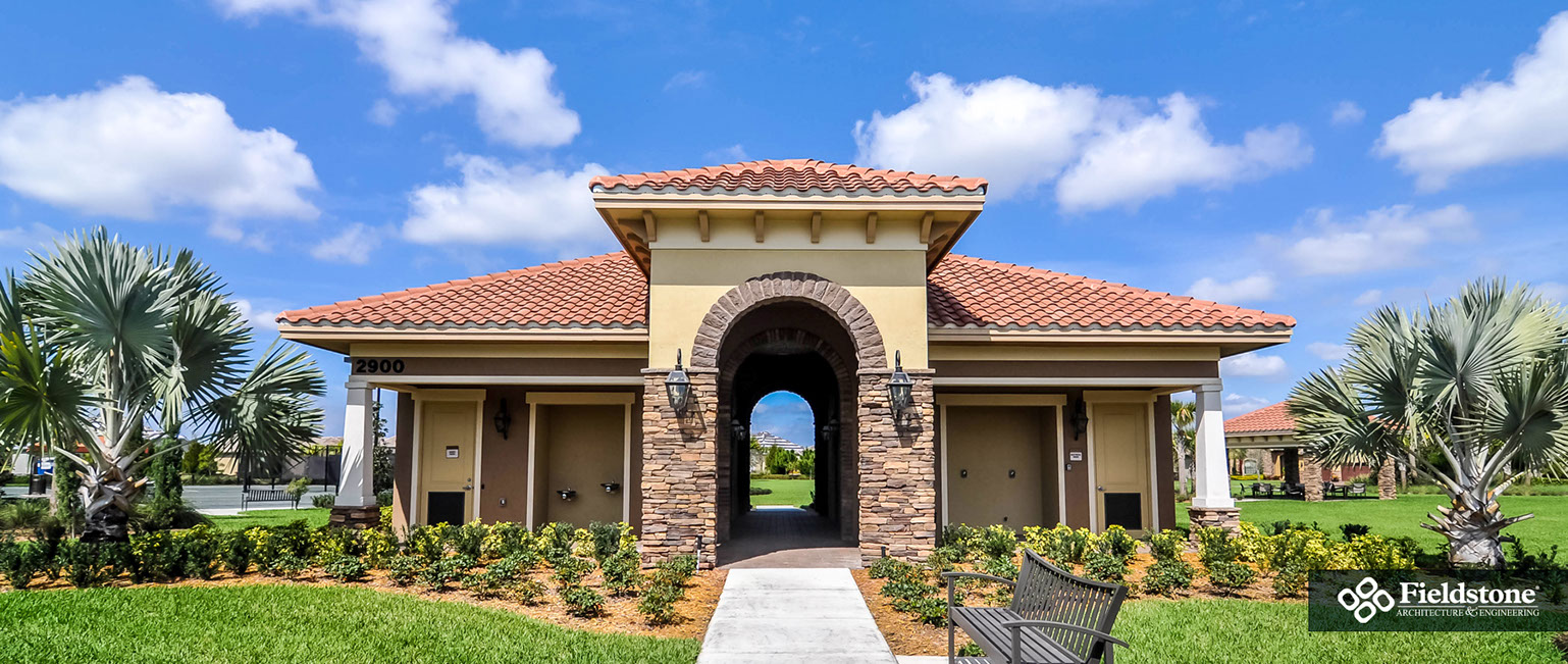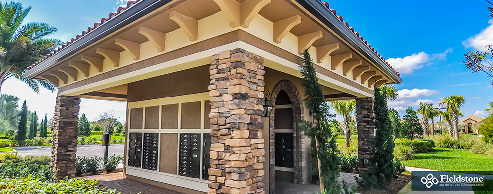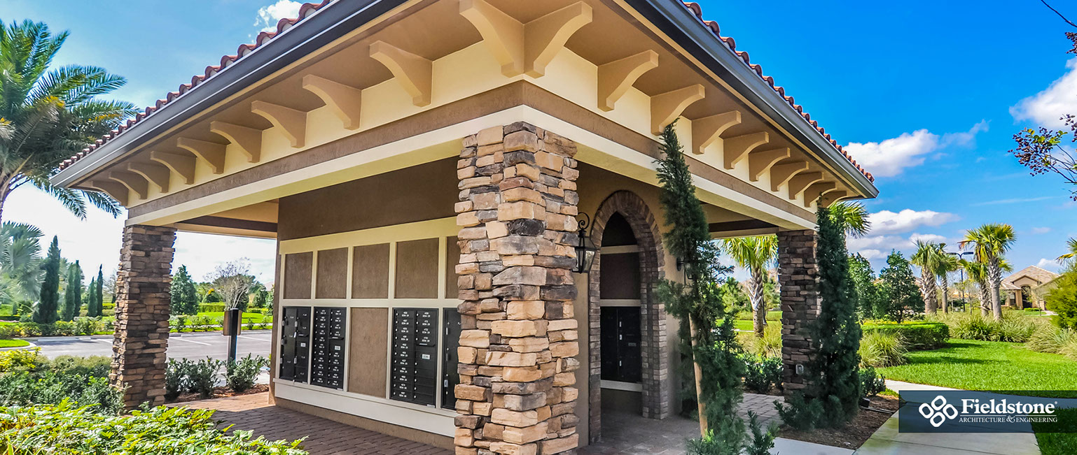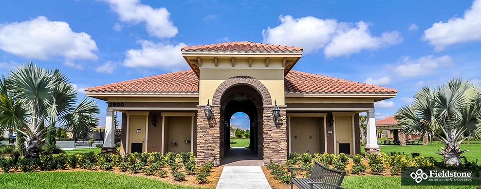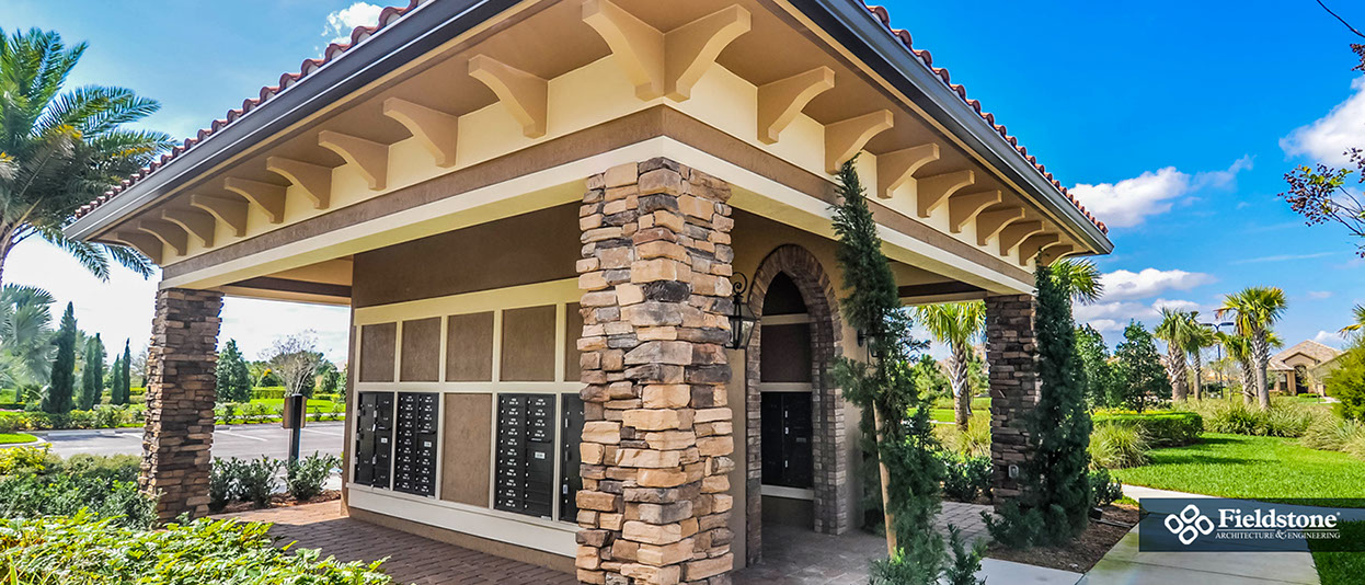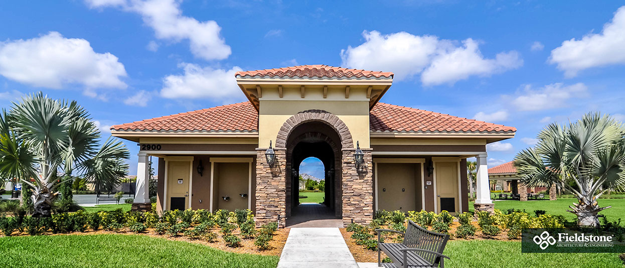 The clubhouse and amenity campus includes a mail kiosk, pool cabana, sports courts cabana, entry guardhouse, and entry sign. All amenities are designed to match the architectural style of the main clubhouse thus establishing a community identity through the architecture.
