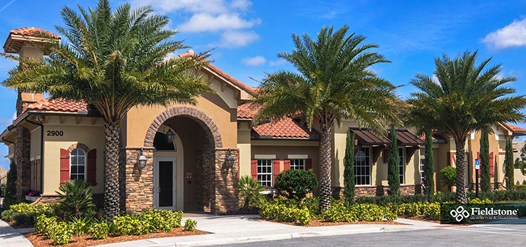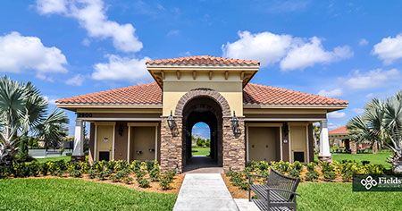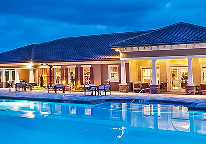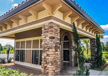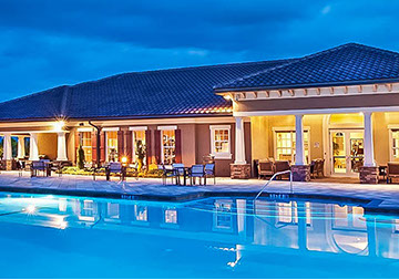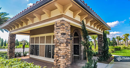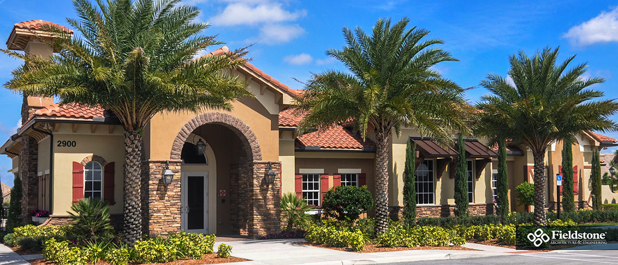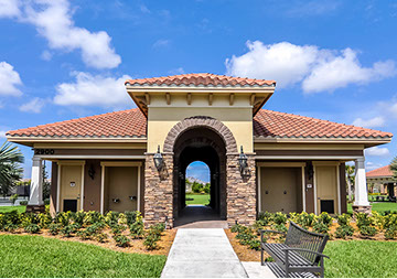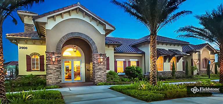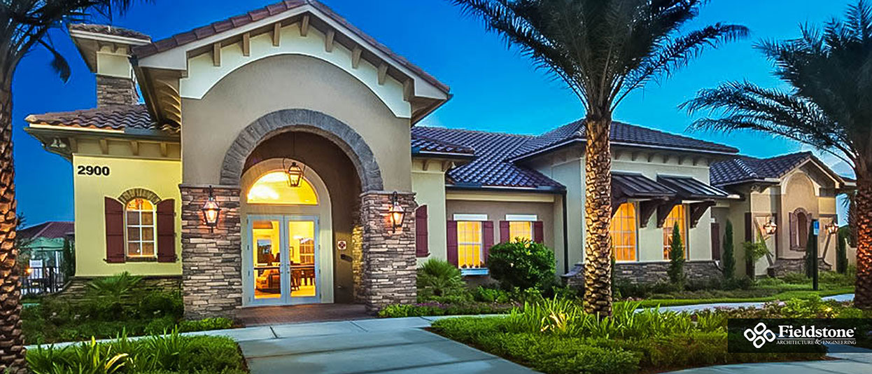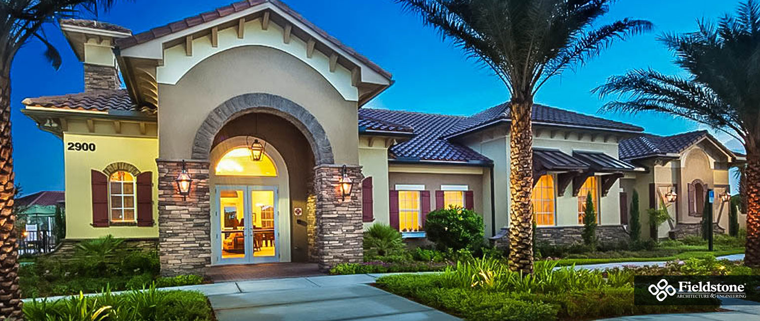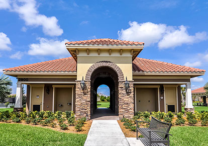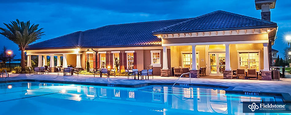 The clubhouse and amenity campus includes a mail kiosk, pool cabana, sports courts cabana, entry guardhouse, and entry sign. All amenities are designed to match the architectural style of the main clubhouse thus establishing a community identity through the architecture.