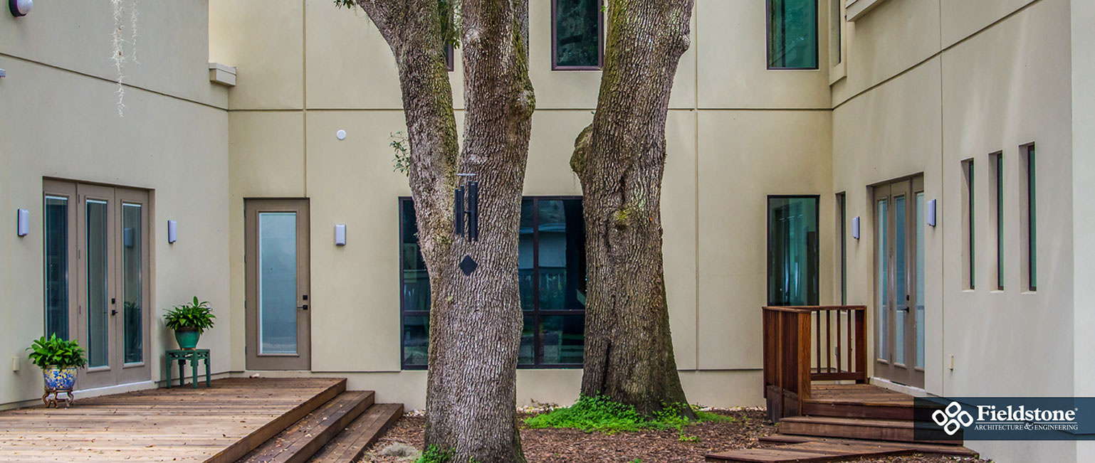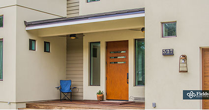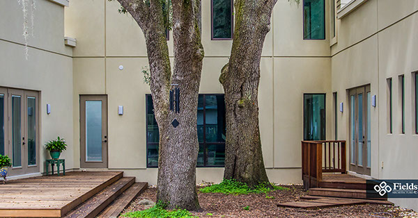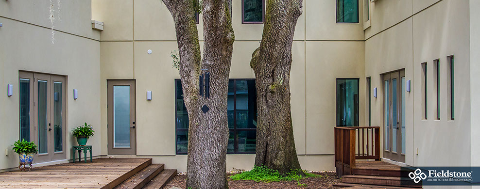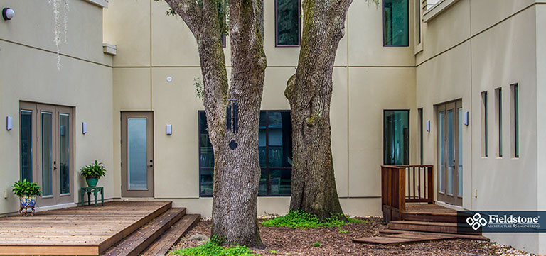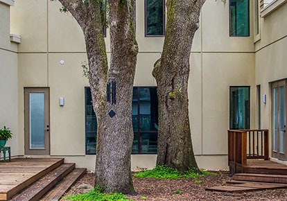 With an open floor plan based around two existing oak trees, the configuration of the rooms creates a variety of spaces for different family activities. The large kitchen looks out to the xeriscape yard and the home office is a glass walled library complete with book ladders.