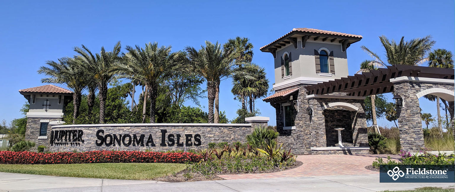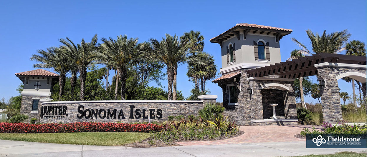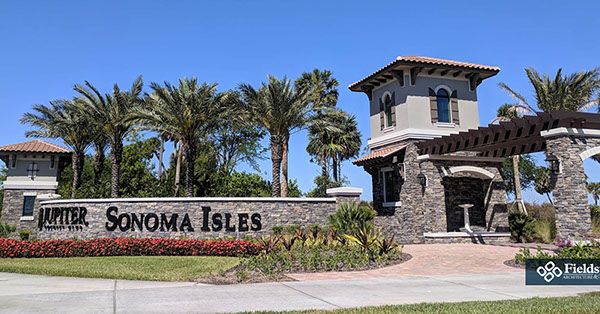 Sonoma Isles is a gated community in Jupiter, Florida. Designed in a Transitional Tuscan style of architecture, this clubhouse includes a fitness center, resort-style pool and spa, fire pit area, sports courts and a tot lot.