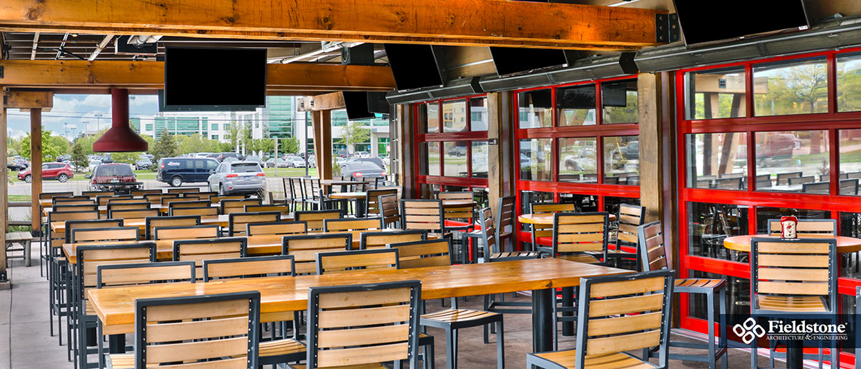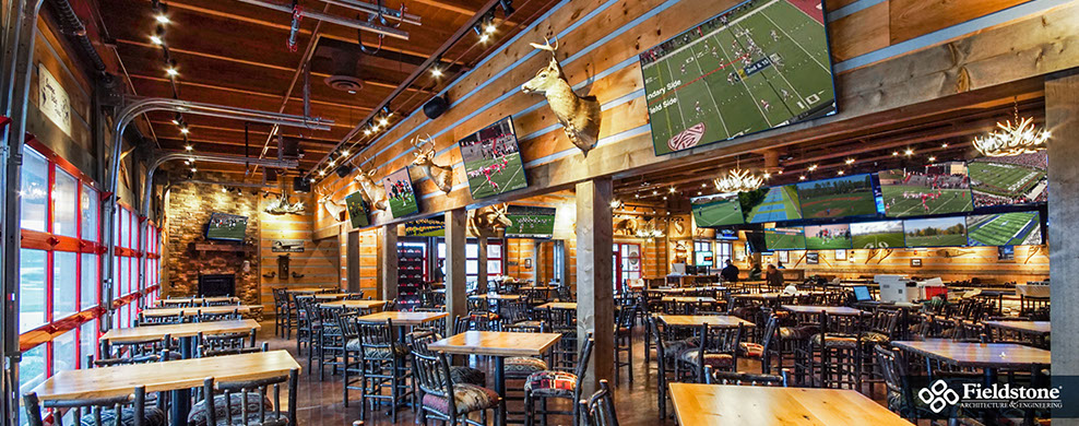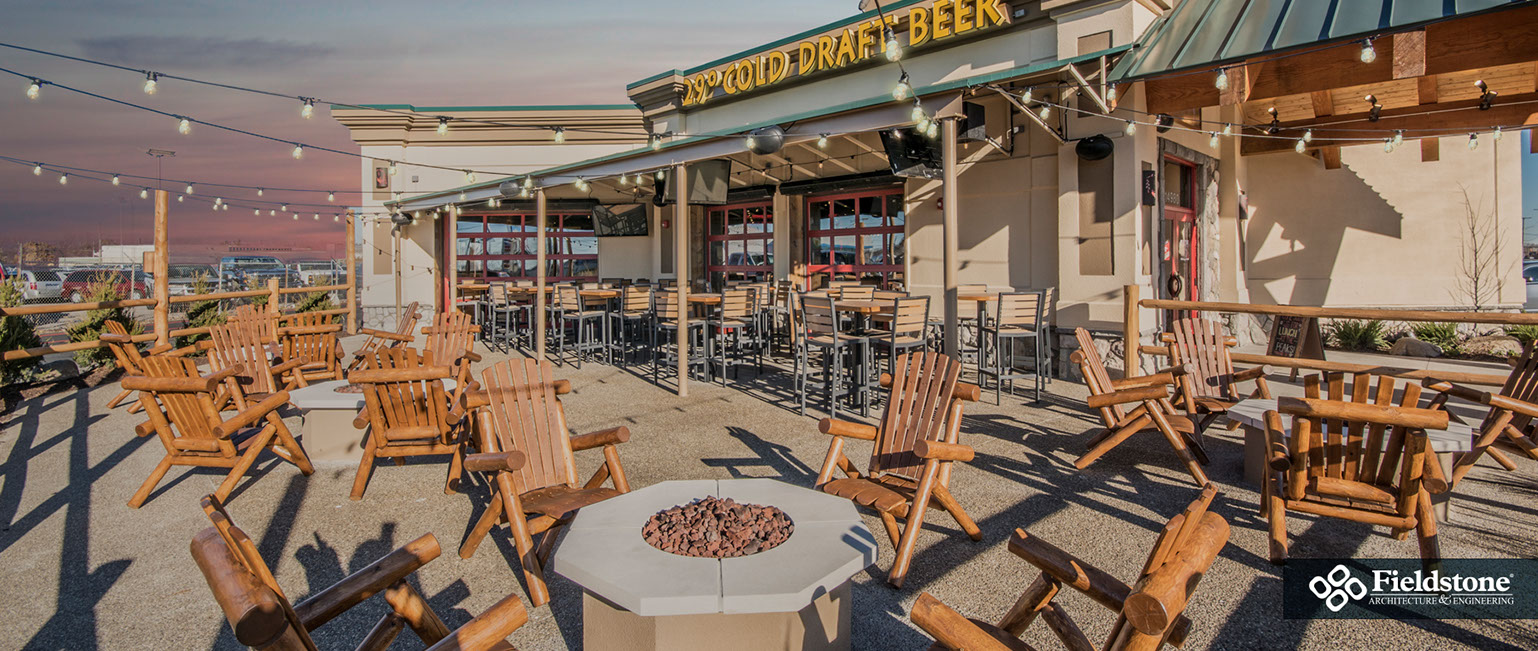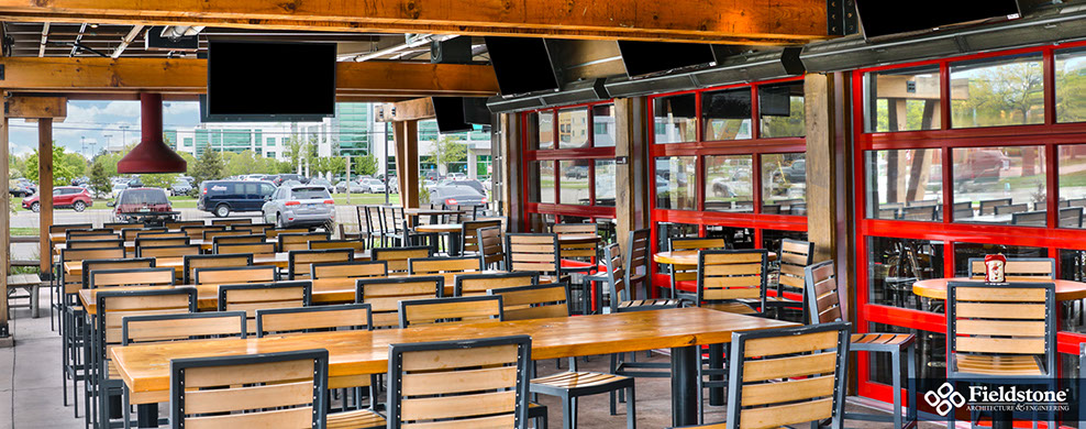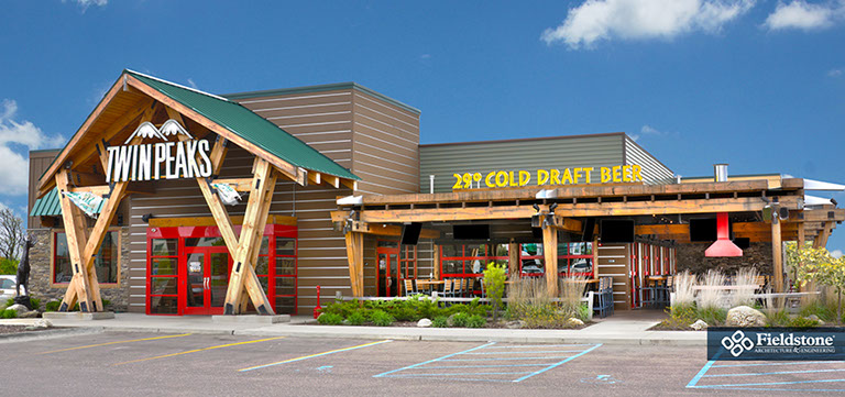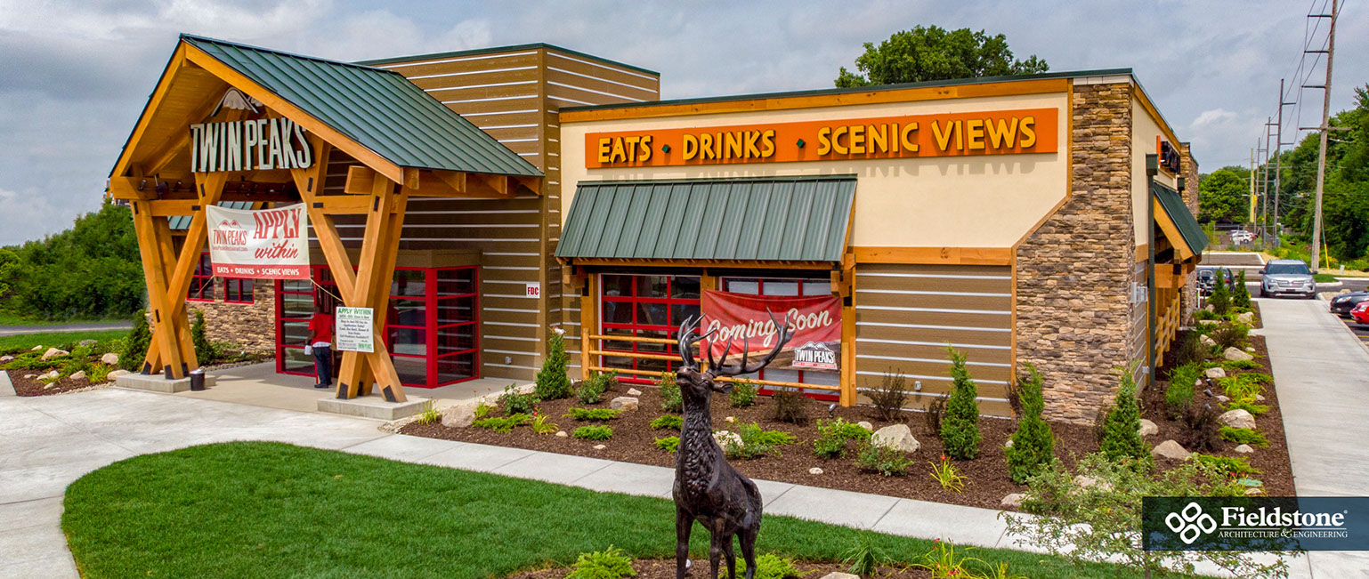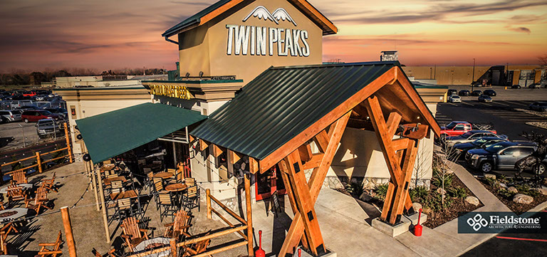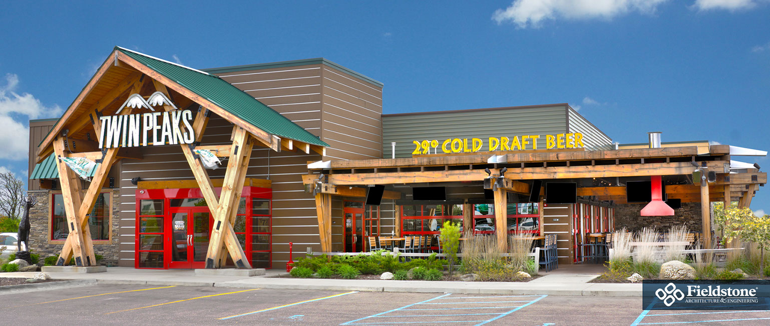 Southgate, MI: Fieldstone A&E renovated former Rosie O’Grady’s Restaurant into a Twin Peaks Restaurant. Renovations included building exterior and interior layout with finishes. The project consists of 9,900 total square feet with indoor seating for 260. The 1,500 sq. ft. outdoor patio area has additional seating for 65 with high-top tables, and cozy fire-pit areas.