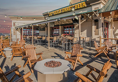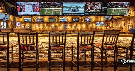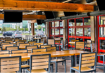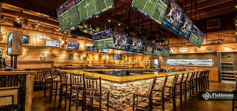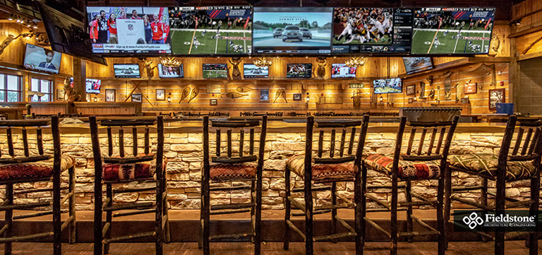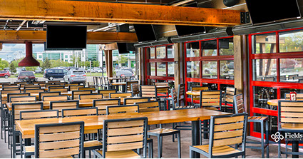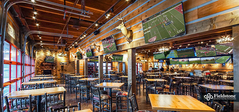 West Chester, OH: Fieldstone A&E renovated a former multi-level Champps Restaurant for this location just outside of Cincinnati, OH. Interior and exterior renovations included an entry addition and layout and finishes for dining and kitchen areas. The 11,000 sq. ft. projects holds a total of 325 seats. Interior dining room and bar has seating of 250, a lounge area holds 15 seats, and 60 seats on the Outdoor Patio including around a fire pit.