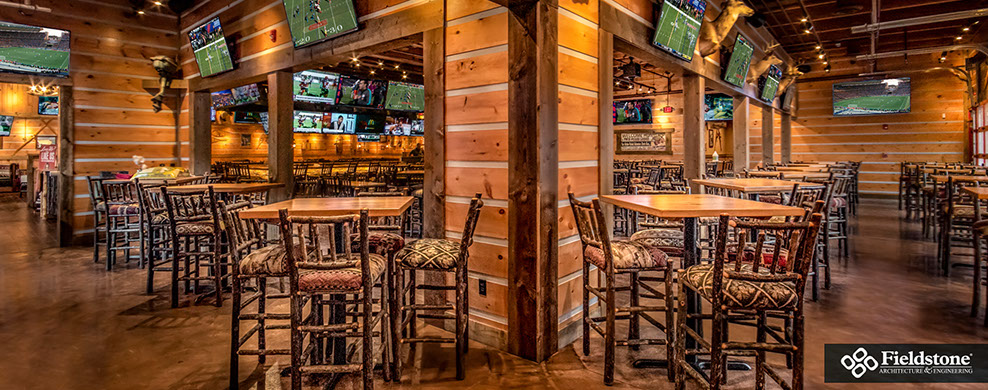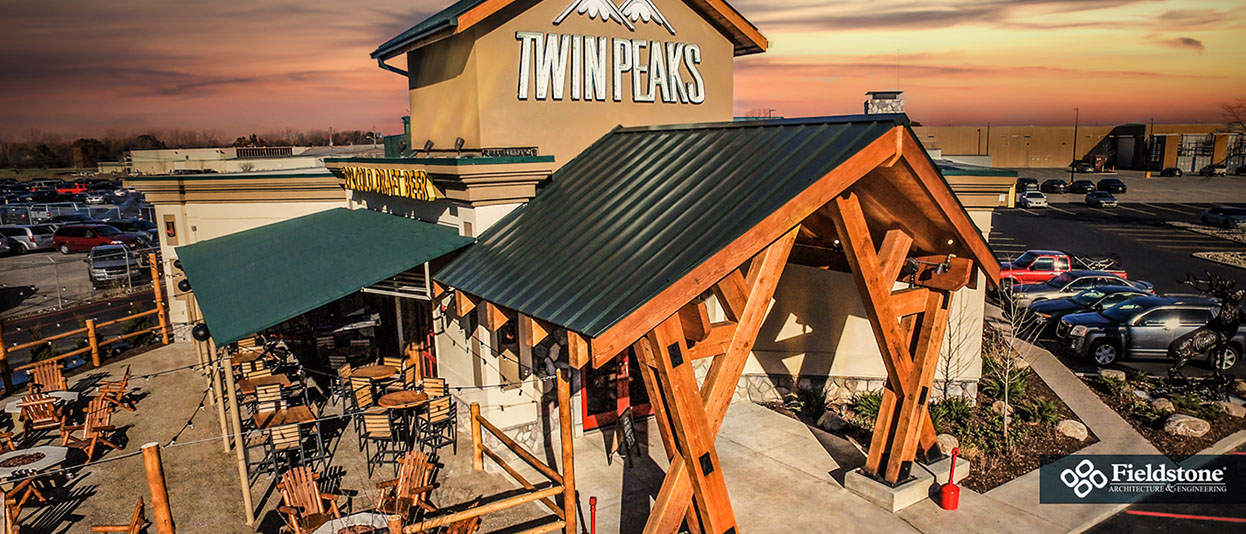 Bryan (College Station) TX: Fieldstone A&E renovated former Kruez Market Restaurant into Twin Peaks Restaurant. Renovation included building exterior with an entry addition and interior renovations to the dining and kitchen areas consisting of layout and finishes. The 9,000 square feet restaurant has seating for 180 in the dining room and bar seating, and additional seating for 50 in a lounge area.