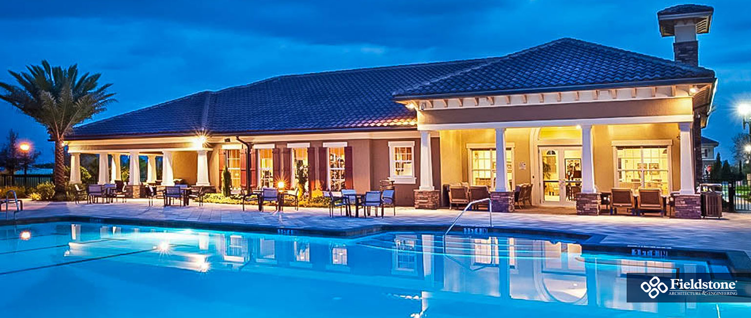 The clubhouse and amenity campus includes a mail kiosk, pool cabana, sports courts cabana, entry guardhouse, and entry sign. All amenities are designed to match the architectural style of the main clubhouse thus establishing a community identity through the architecture.