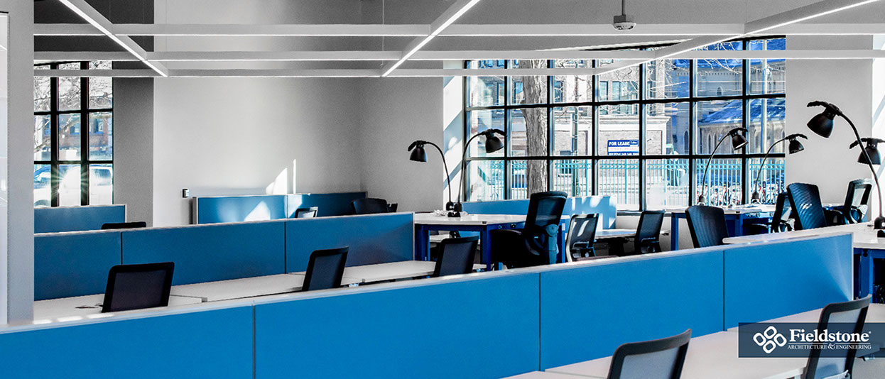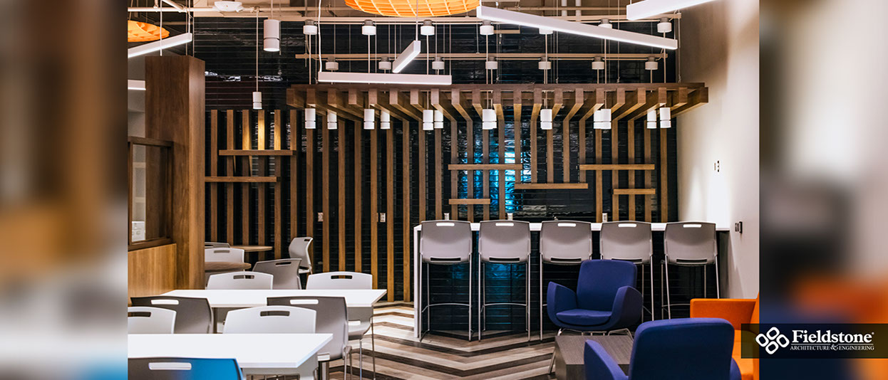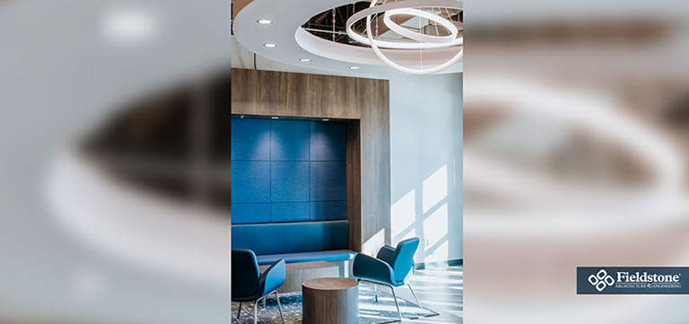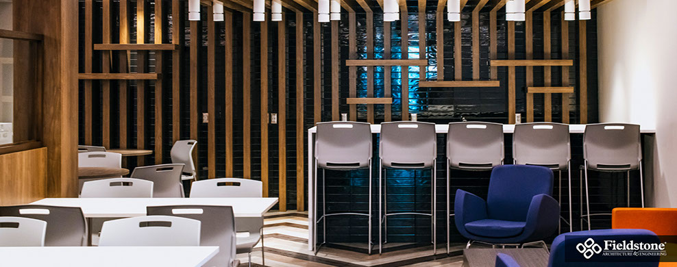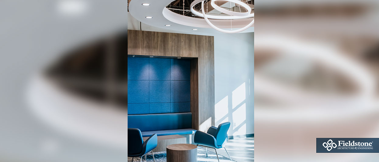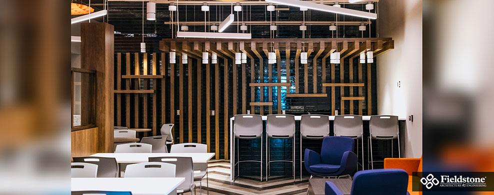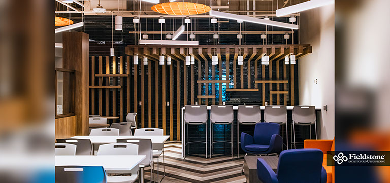 The space includes reception area, open office area, private offices, collaboration area, large conference room, staff lounge, and testing lab facility area. Fieldstone A&E provided Architecture, Engineering, Interior Design and Construction Administration.