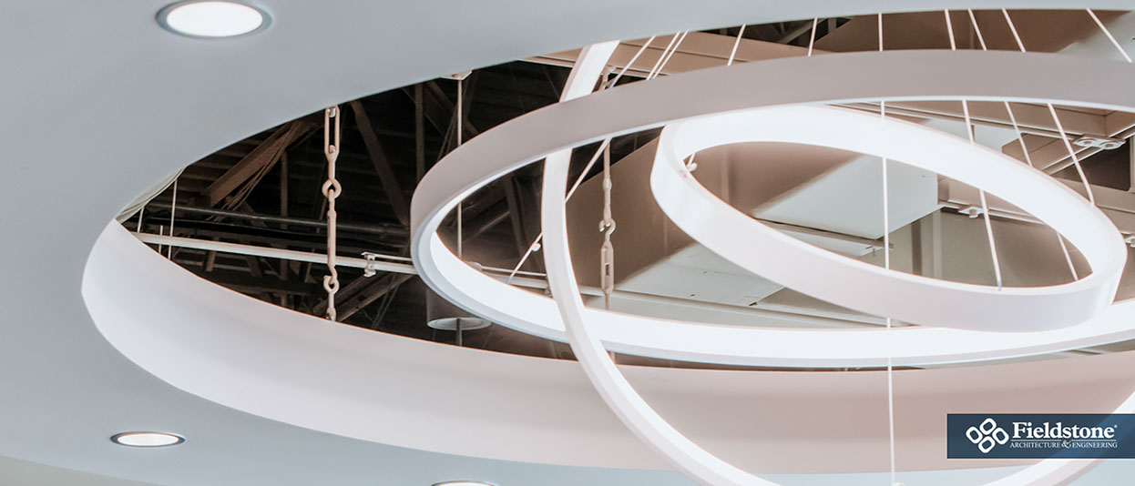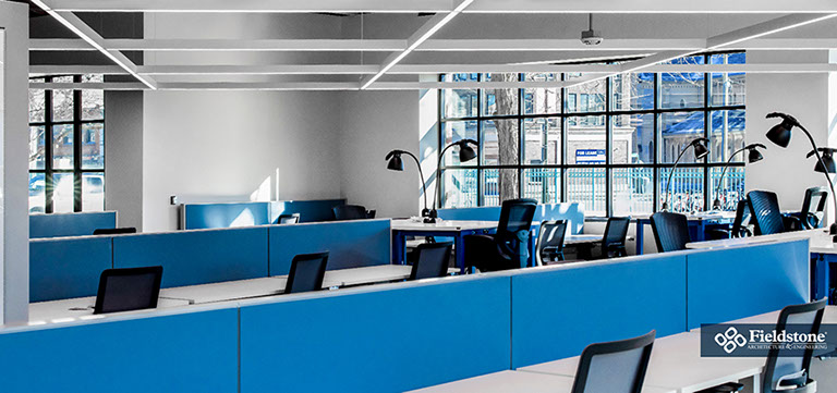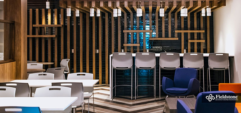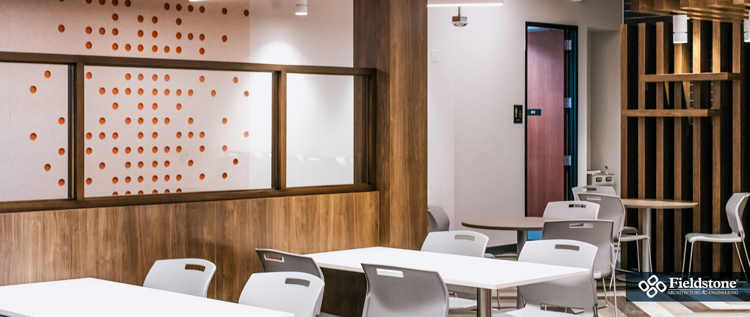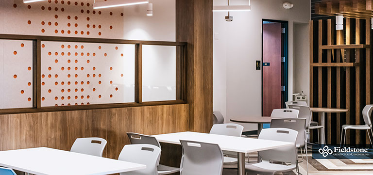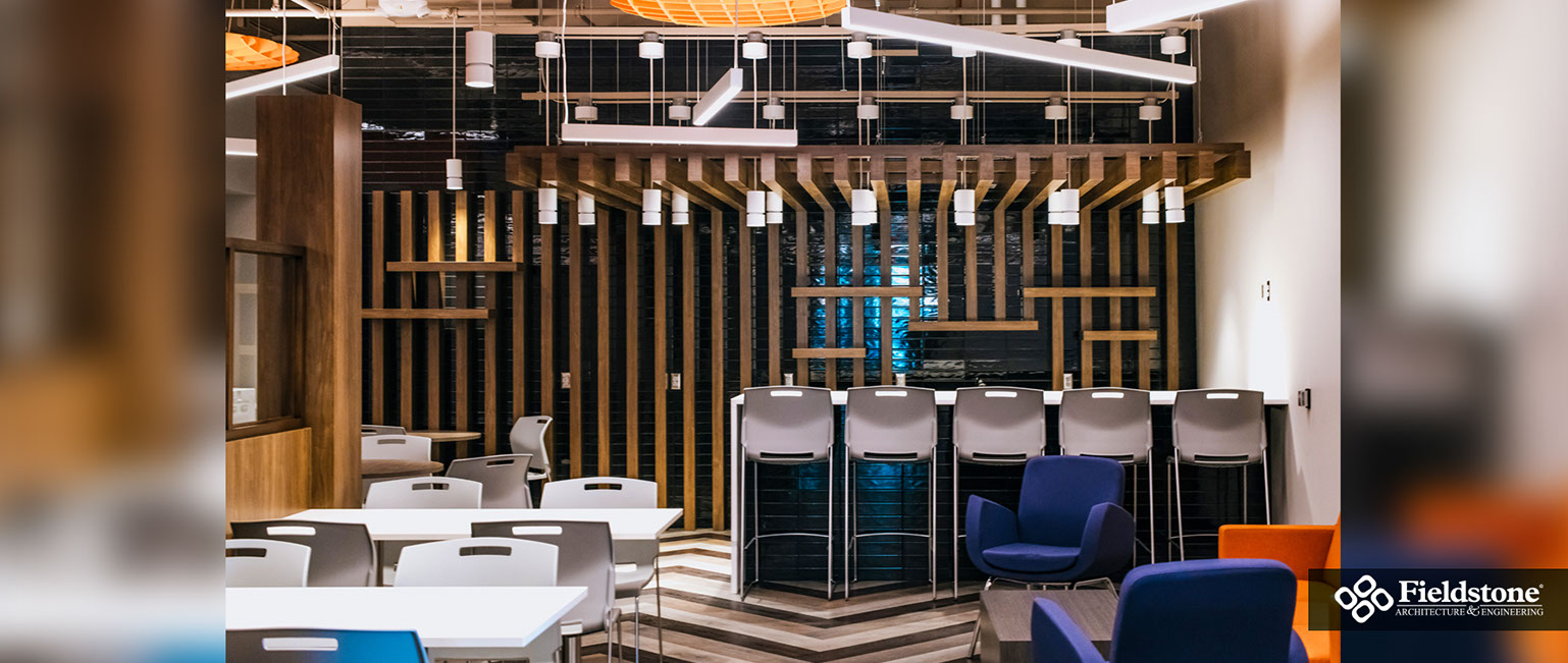 The space includes reception area, open office area, private offices, collaboration area, large conference room, staff lounge, and testing lab facility area. Fieldstone A&E provided Architecture, Engineering, Interior Design and Construction Administration.