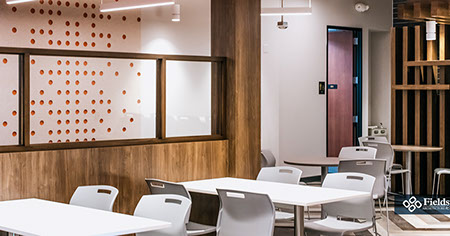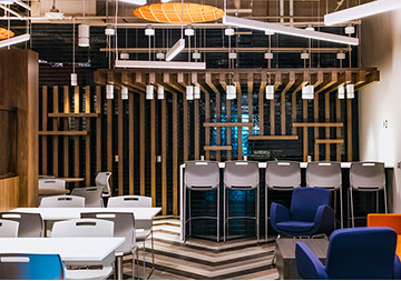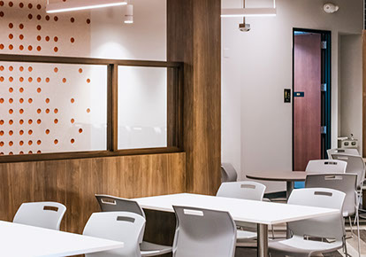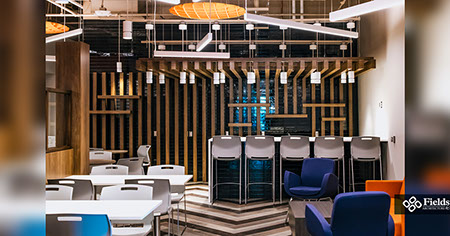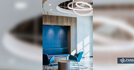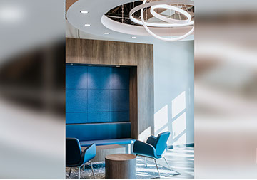 The free-flowing modern space has stylish accents throughout with its pops of color from acoustical clouds and wall panels to the chevron patterned LVT flooring. The placement of vertical and horizontal beams serves as a striking architectural element while also defining the café area of the staff lounge. Visitors are greeted with the history of the company: shown in photos on a customized canopy that is made up of backlit acrylic panels over the reception desk.