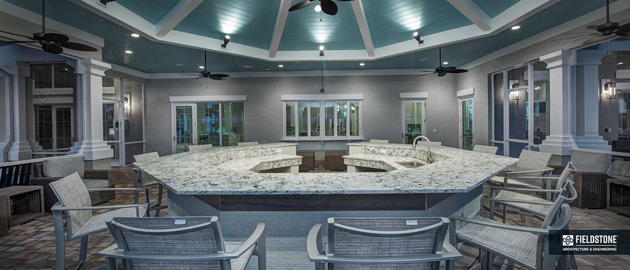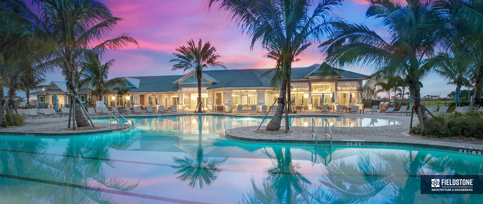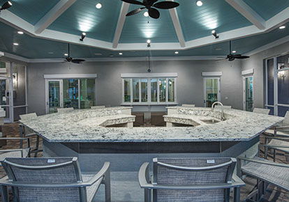 Designed in coastal style with some bright Key West influences. The clubhouse features a large social room with catering kitchen, a cafe and lounge area for small gatherings, and craft room. There is a large fitness wing with equipment room, movement studio and locker rooms. The outdoor veranda and pool area are designed for entertaining, with several seating areas, a bar open for use by residents, an outdoor billiard table, and large pool with canopies and cabanas.
