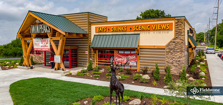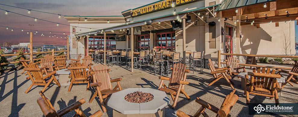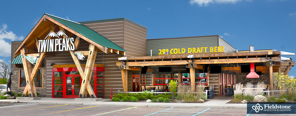 Southgate, MI: Fieldstone A&E renovated former Rosie O’Grady’s Restaurant into a Twin Peaks Restaurant. Renovations included building exterior and interior layout with finishes. The project consists of 9,900 total square feet with indoor seating for 260. The 1,500 sq. ft. outdoor patio area has additional seating for 65 with high-top tables, and cozy fire-pit areas.