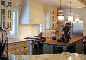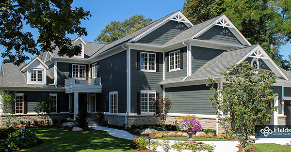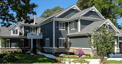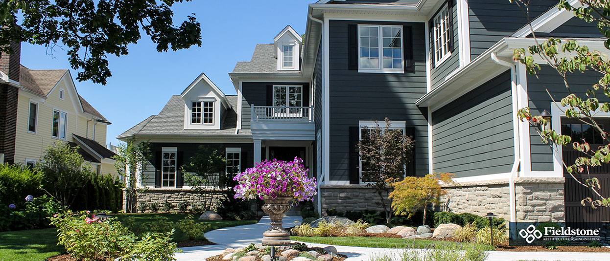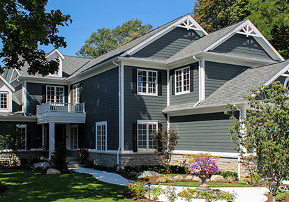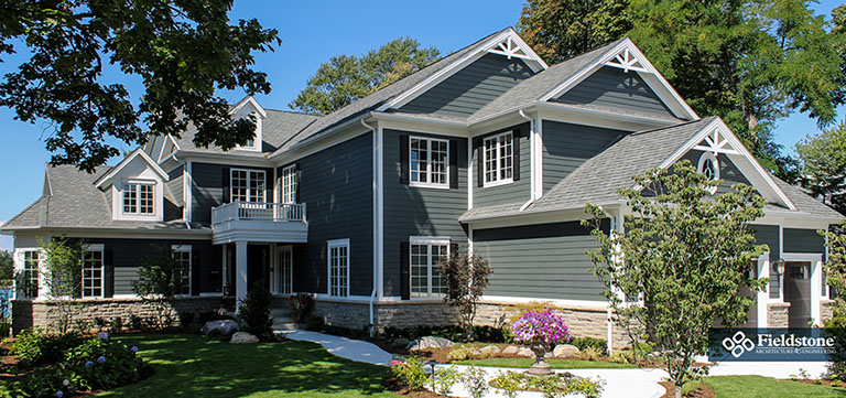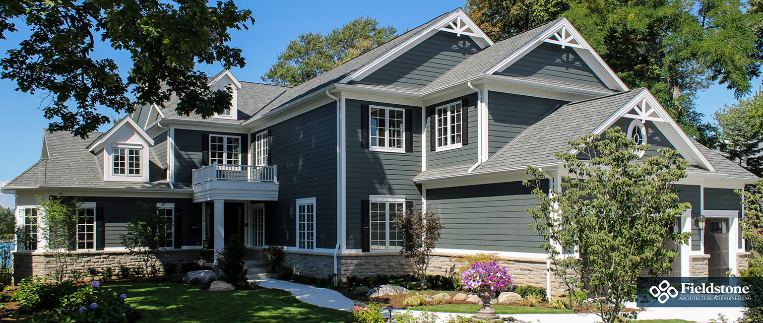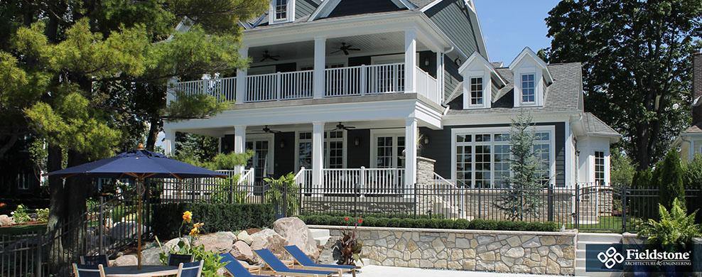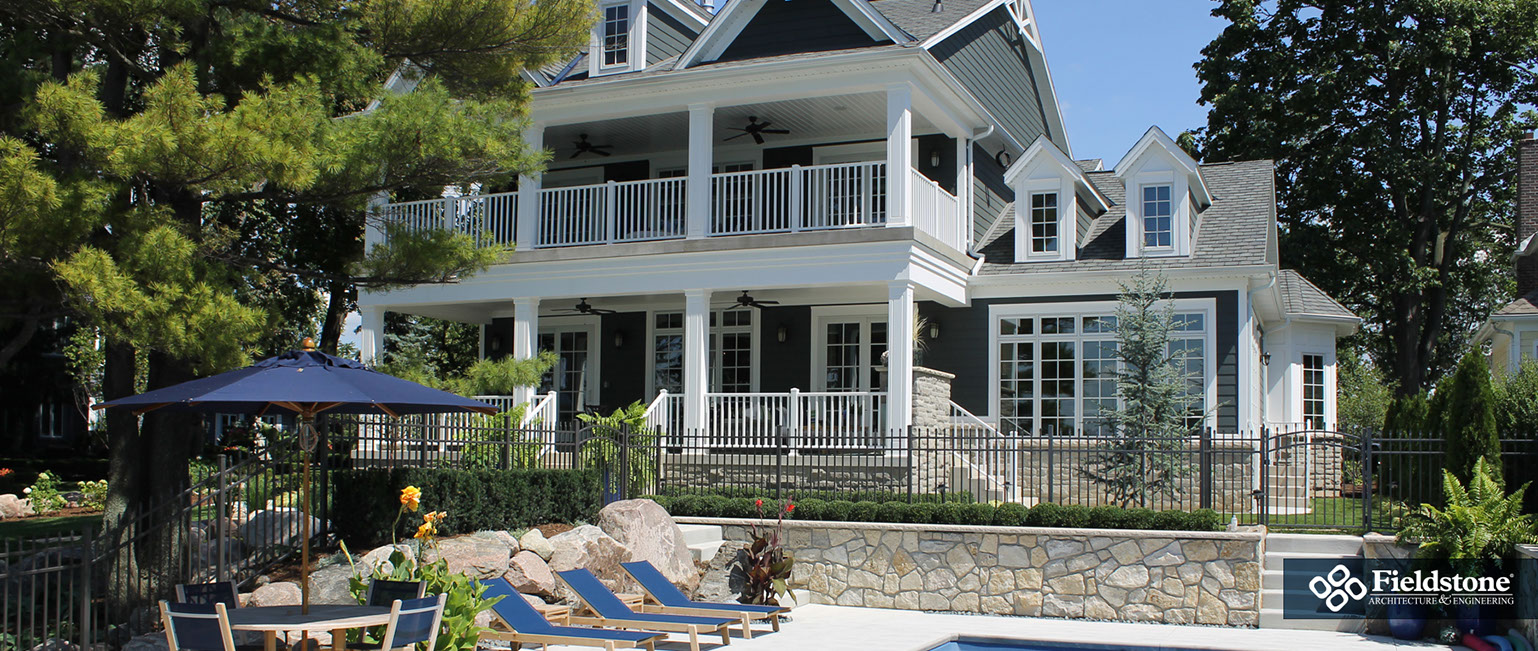 This Country style home features an elaborate series of stepped elevations and balconies in order to take advantage of the natural site features.