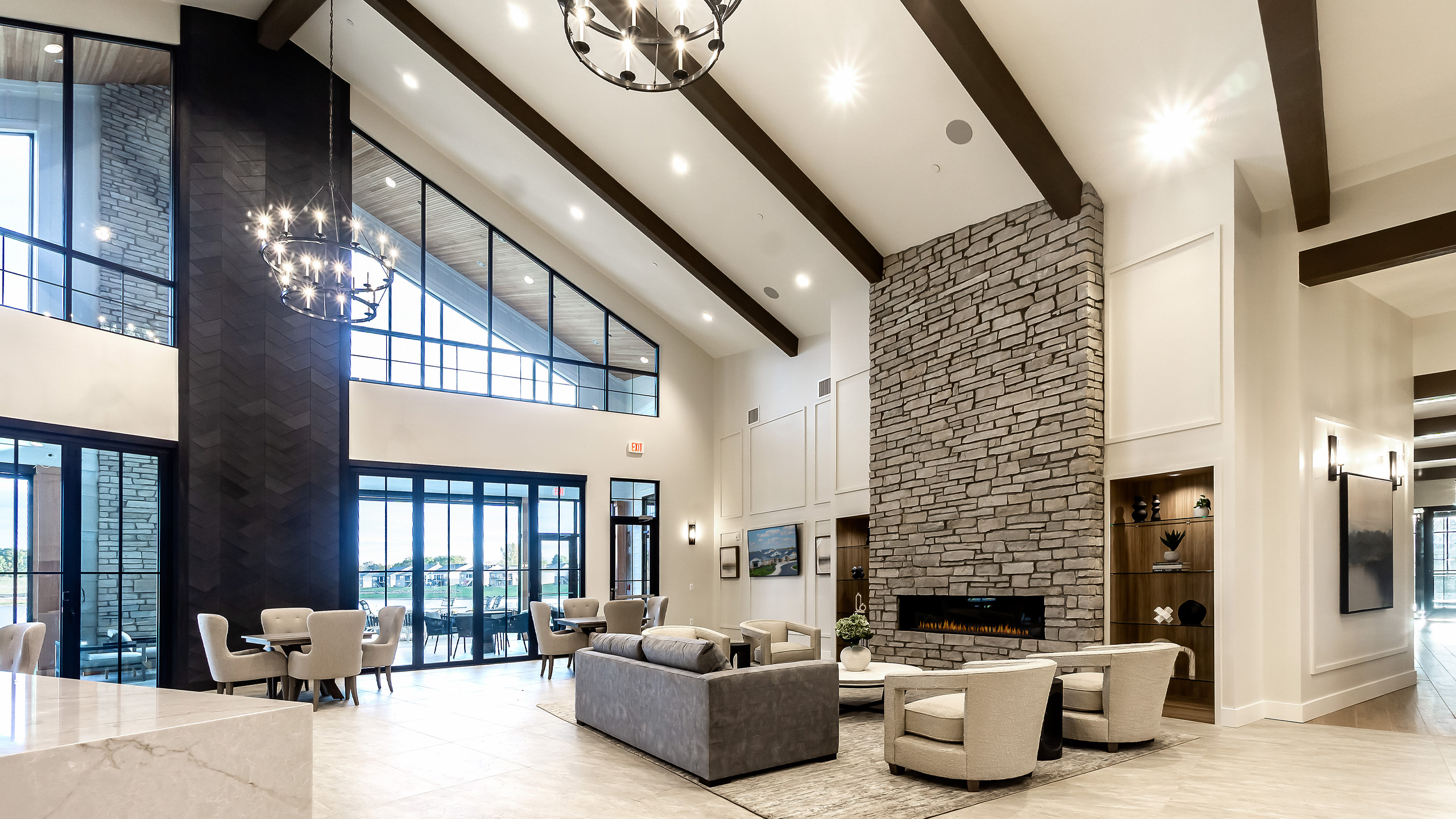 One of the standout design elements is the seamless flow between indoor and outdoor spaces. The Veranda, with its soaring ceiling and two-sided fireplace, opens to the Grand Patio, where there is plenty of table seating as well as cozy seating around fire tables. Beyond that, residents can enjoy: