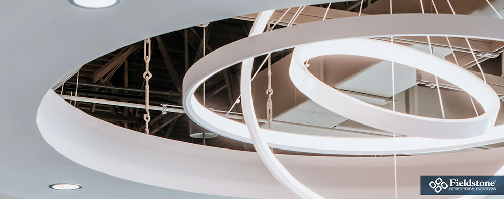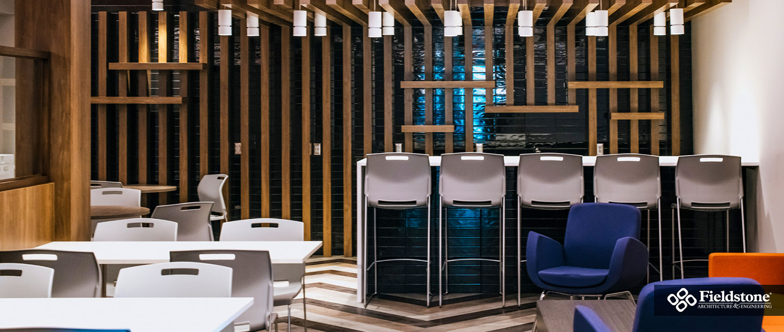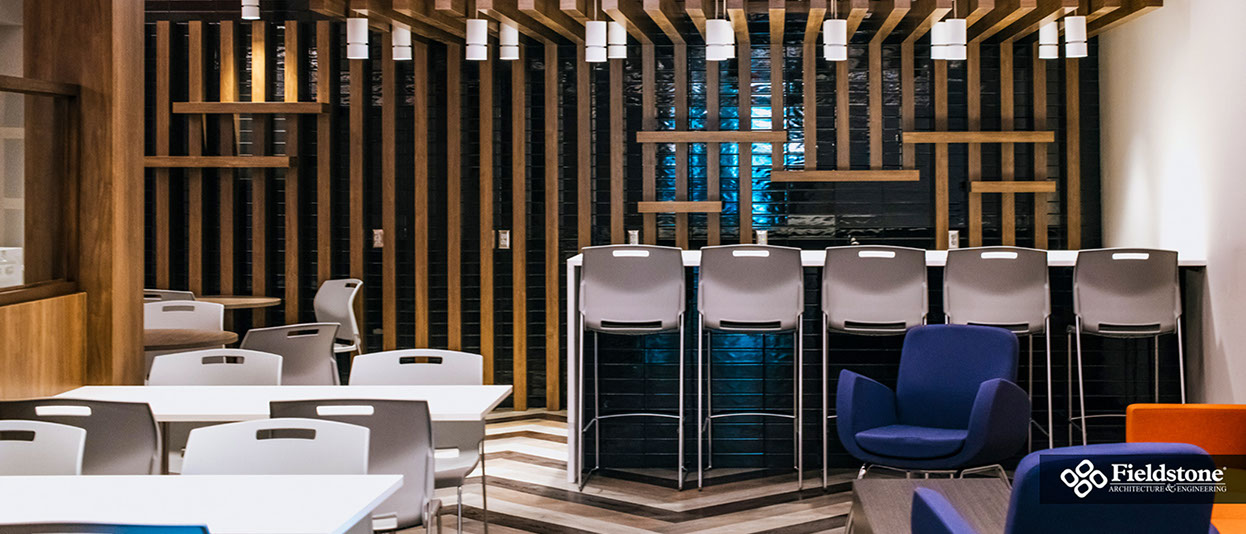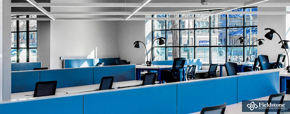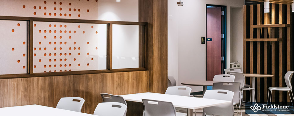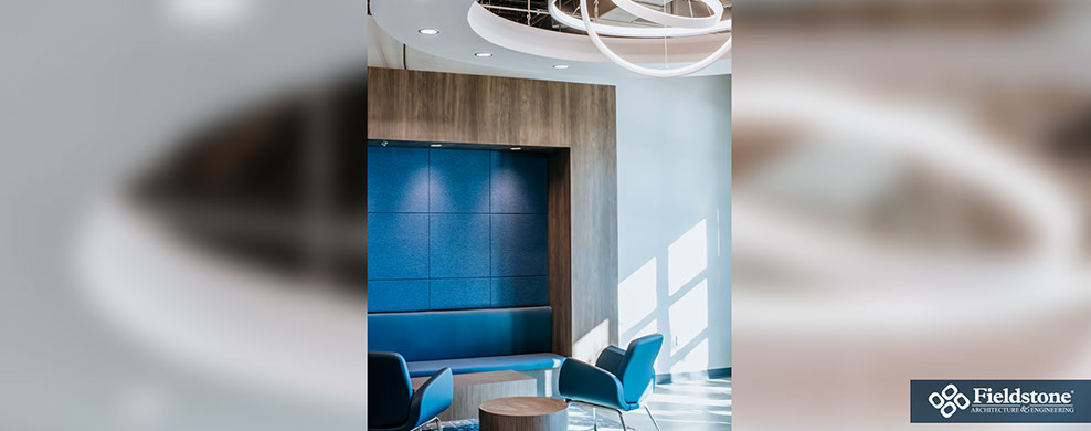 The space includes reception area, open office area, private offices, collaboration area, large conference room, staff lounge, and testing lab facility area. Fieldstone A&E provided Architecture, Engineering, Interior Design and Construction Administration.