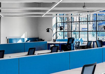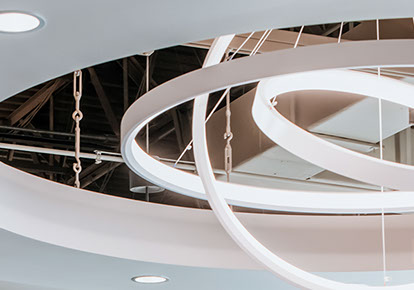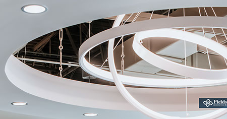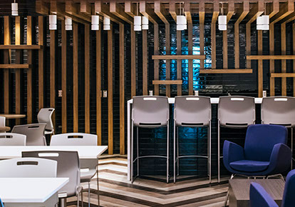 The free-flowing modern space has stylish accents throughout with its pops of color from acoustical clouds and wall panels to the chevron patterned LVT flooring. The placement of vertical and horizontal beams serves as a striking architectural element while also defining the café area of the staff lounge. Visitors are greeted with the history of the company: shown in photos on a customized canopy that is made up of backlit acrylic panels over the reception desk.