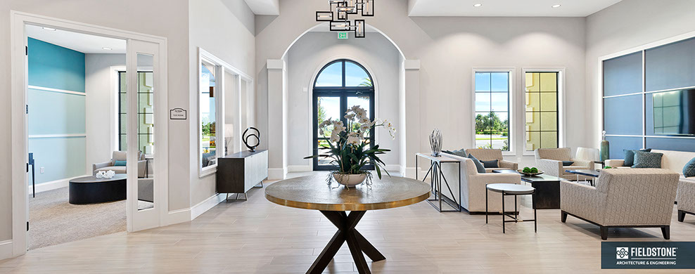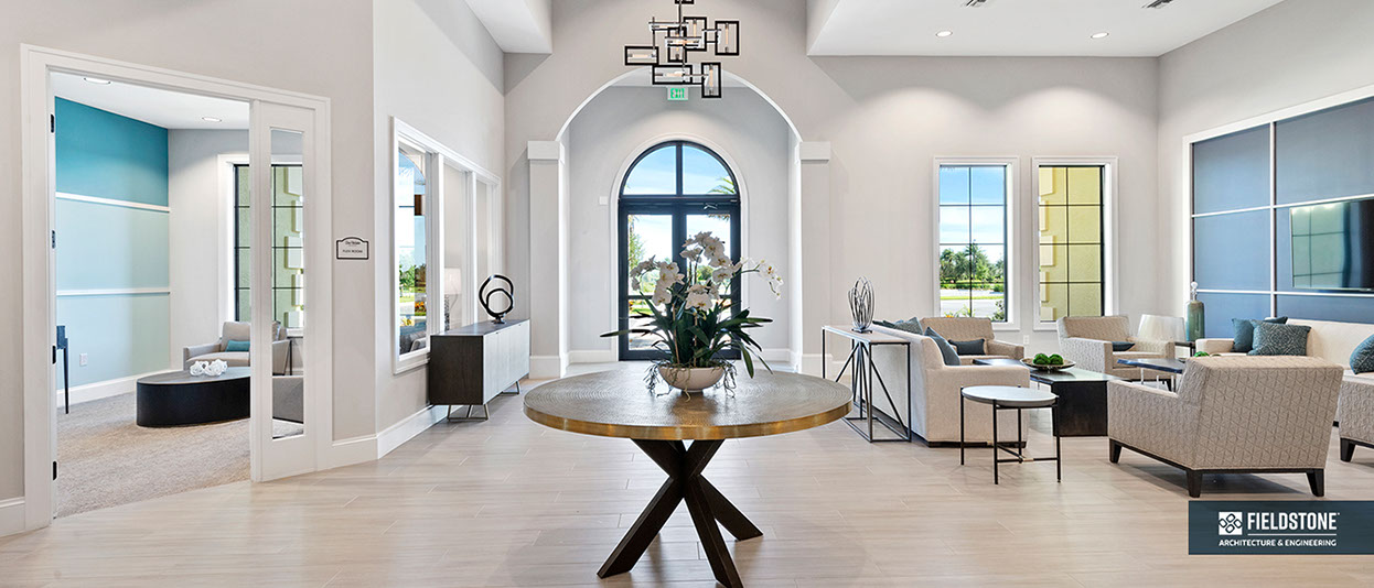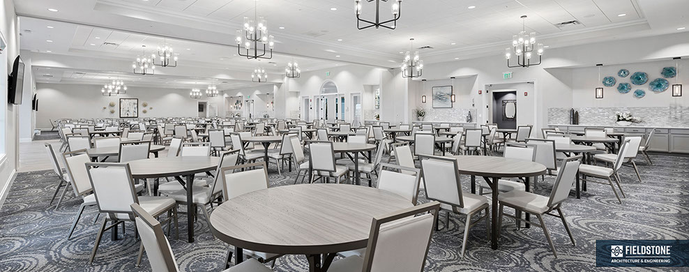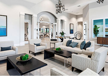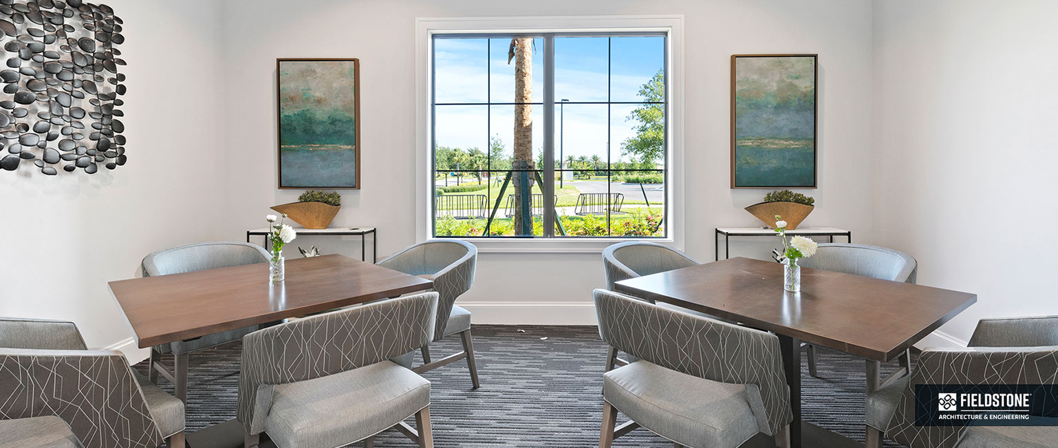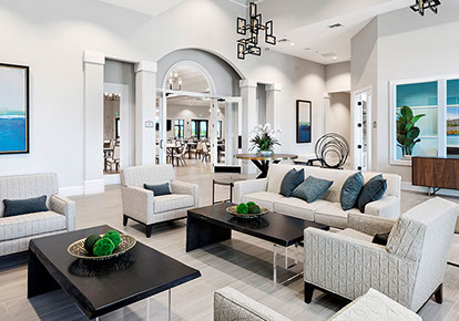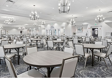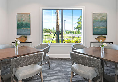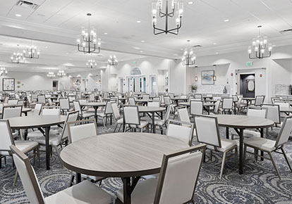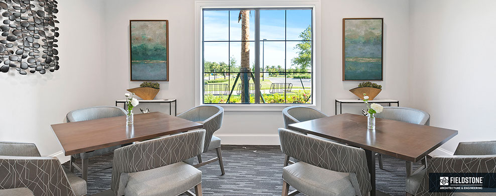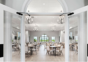 This is one of four buildings on the campus and serves as the main social/activity building. The building offers several card rooms, a game room with darts and billiards, a golf simulator, and a large ball/social room. The interior design boasts a more contemporary transitional feel.