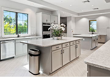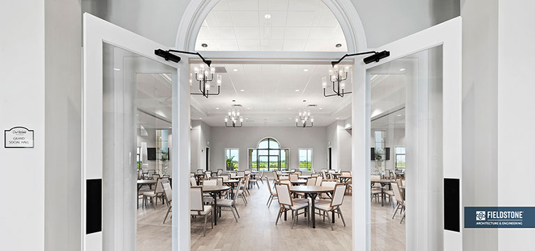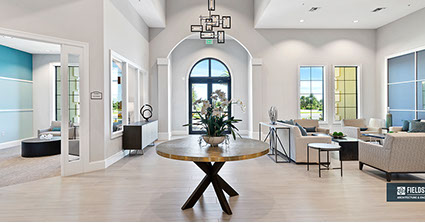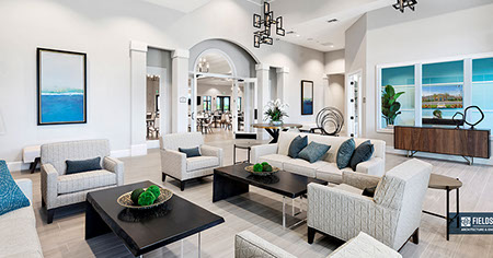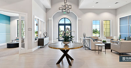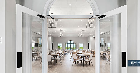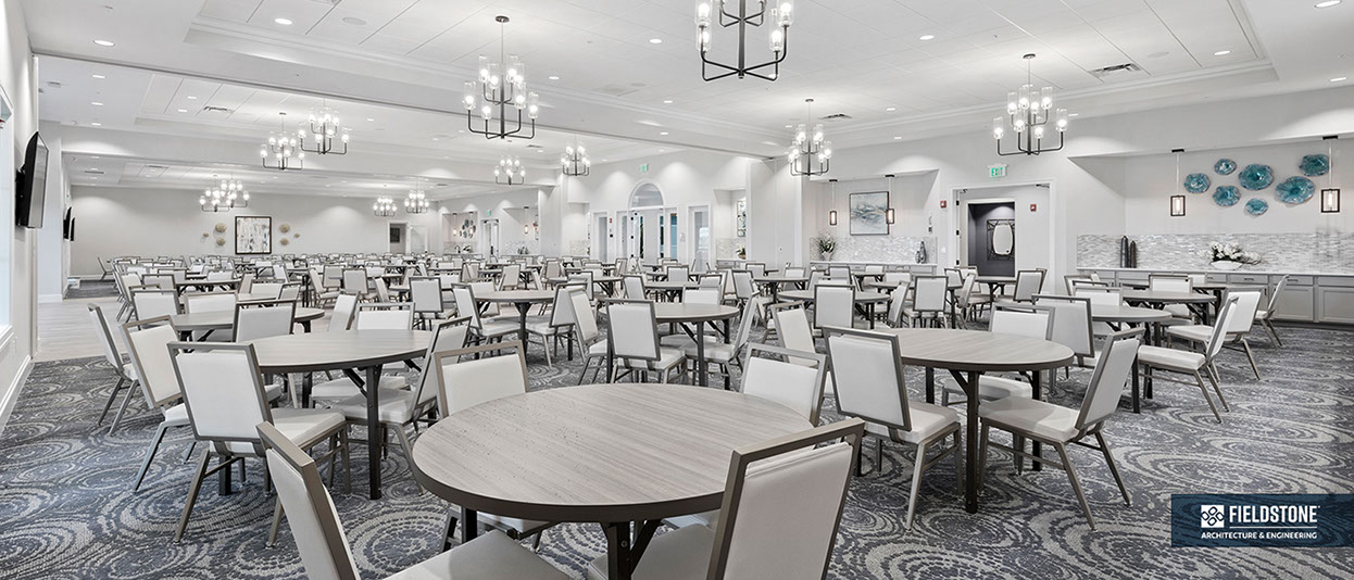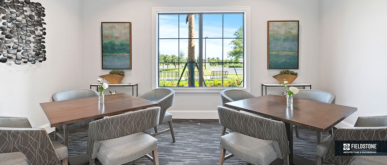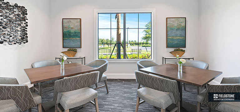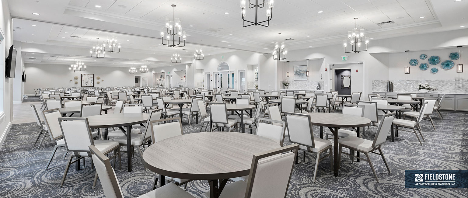 This is one of four buildings on the campus and serves as the main social/activity building. The building offers several card rooms, a game room with darts and billiards, a golf simulator, and a large ball/social room. The interior design boasts a more contemporary transitional feel.